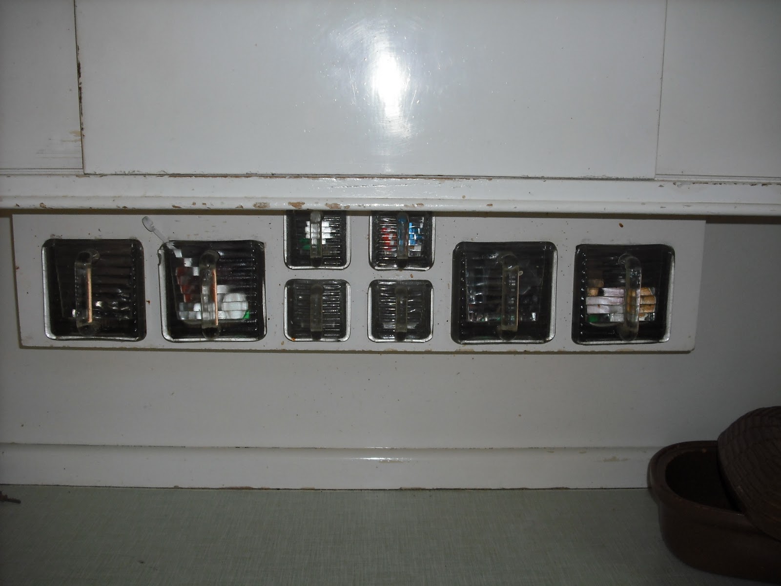 Hier der Küchenschrank meiner Großeltern. Ich finde ihn eigentlich sehr schön, obwohl man ihn mal etwas streichen könnte. Schönes Detail sind die gläsernen Schubfächer in der Mitte. 60er Jahre.